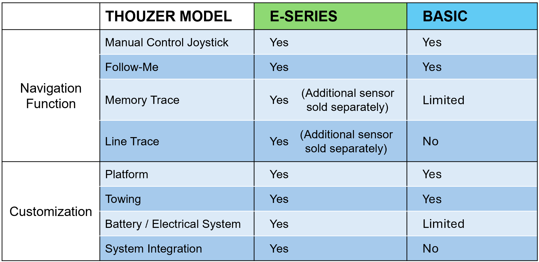 Thouzer detects the retroreflective line with the laser sensor from a distance and automatically moves along the retroreflective line. If there are obstacles in it’s path, it will sound an alarm and stop until the obstacle is cleared.