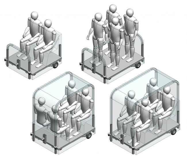 また、従来までの2人乗り限定した筐体から刷新されて、2~4人乗りを実現する汎用的な構造の台車に進化し、バッテリー容量、座席レイアウト、筐体デザイン等を自由にカスタマイズしていただけるハイエンドロボット台車となりました。
